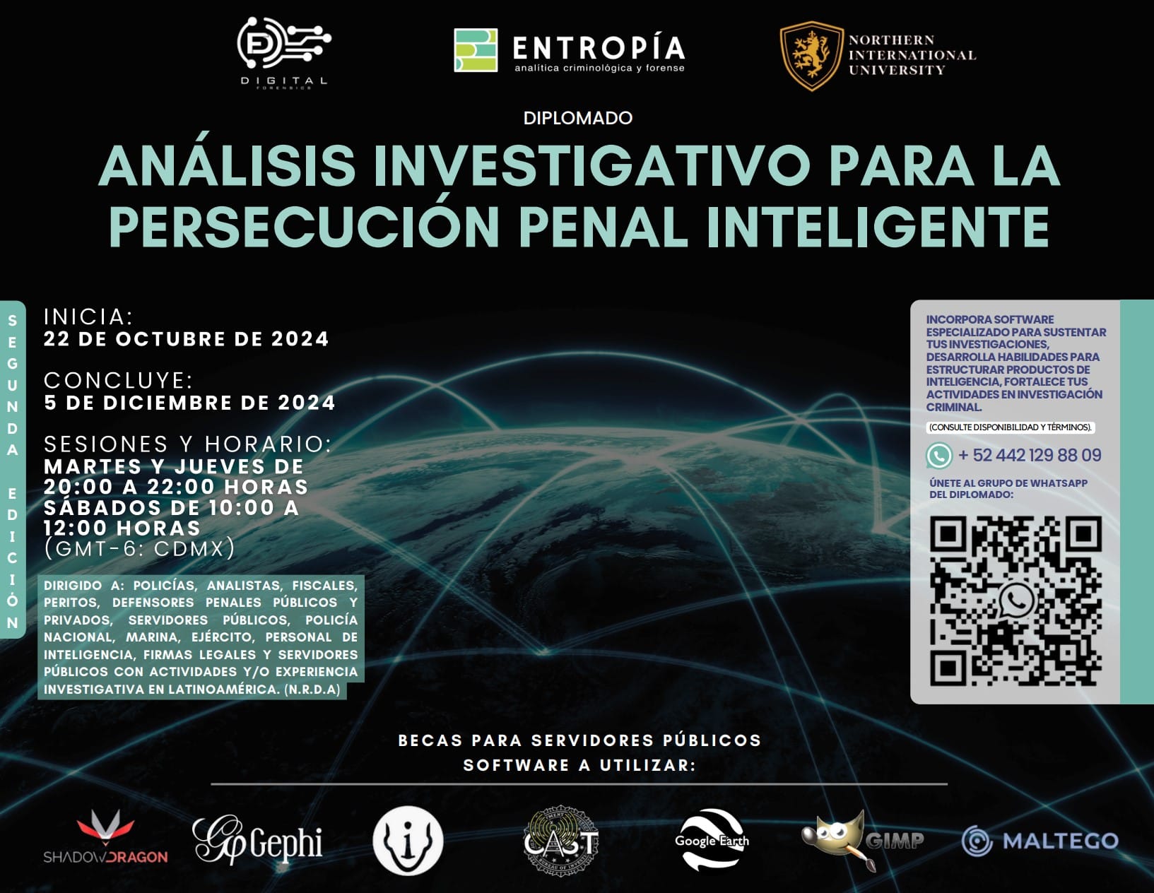 Adquirirán competencias en el uso de software especializado (libre y versiones gratuitas), como CASTViz, Gephi, Yappari, Maltego, ShadowDragon, Gimp, Excel, PowerPoint, Google Earth y My Maps, facilitando el tratamiento de datos e información, generando conocimiento que permita el esclarecimiento de hechos delictivos.